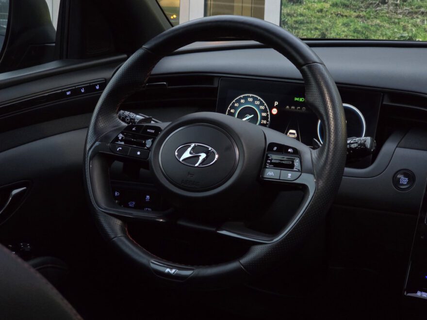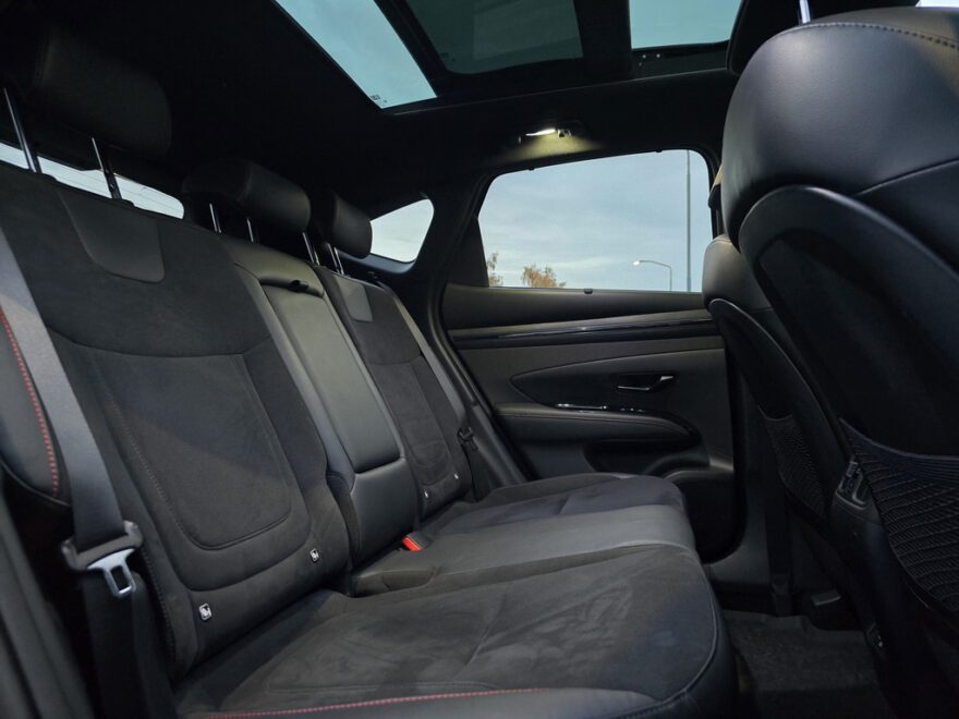De N Line-uitvoering geeft de Tucson een sportieve uitstraling met strakke lijnen, een krachtige look en een interieur dat luxe en dynamiek uitstraalt. Zodra je instapt, voel je direct de kwaliteit en het oog voor detail. De panoramadak laat het interieur baden in licht, terwijl de verwarmde stoelen en het verwarmde stuur zorgen voor comfort op koude dagen. Dankzij het geheugen voor de bestuurdersstoel stap je altijd in met jouw ideale zitpositie.